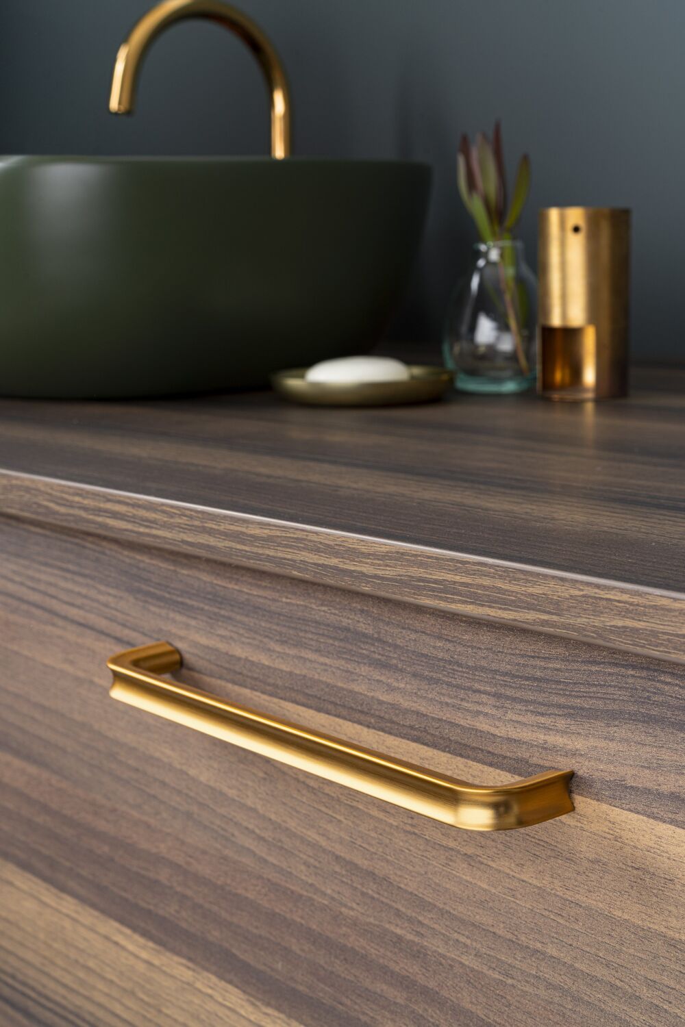 Deze stijlvolle Lipp greep is vervaardigd uit duurzaam metaal en afgewerkt in mat geborsteld messing. Het strakke, moderne ontwerp met afgeronde hoeken en subtiele lipvorm maakt deze greep een elegante toevoeging aan zowel keukens als badkamermeubels.